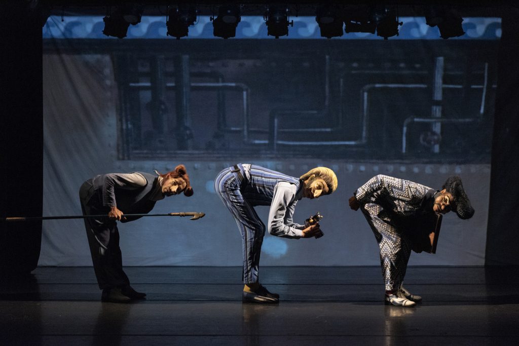 O principal elemento cenográfico é o corpo de cada ator, com seus comportamentos físicos que descrevem a espacialidade ao seu redor.