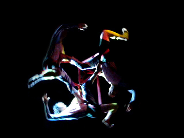 As imagens geométricas de um caleidoscópio são redesenhadas nesse número, por três corpos suspensos. Enquanto os acrobatas realizam a coreografia aérea num aparelho que gira continuamente, uma câmera de vídeo capta a ação que é projetada simultaneamente num telão.