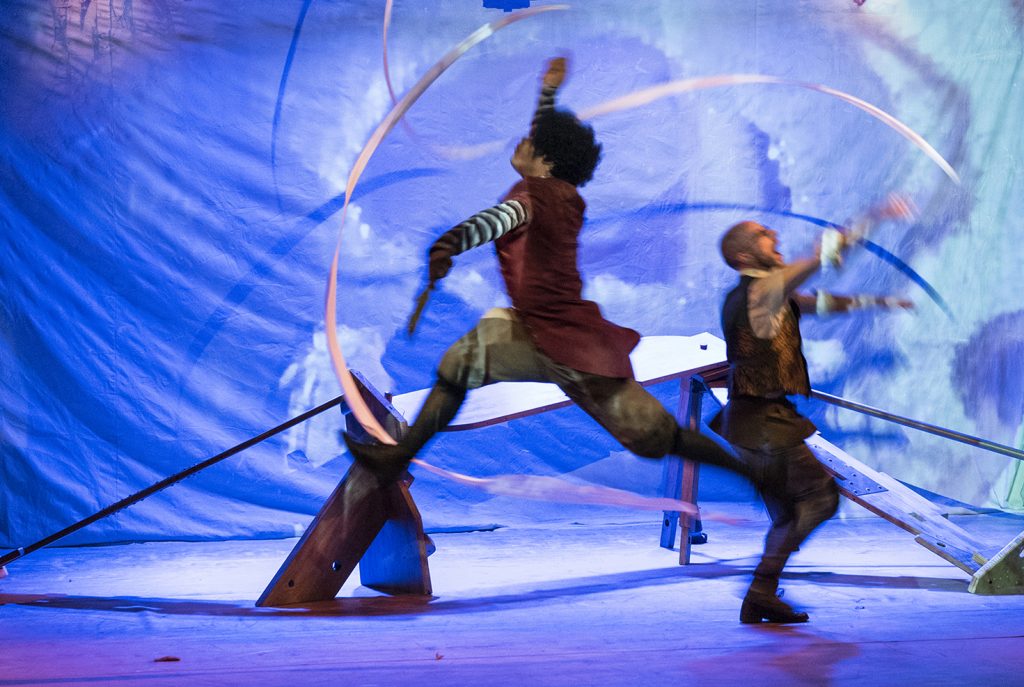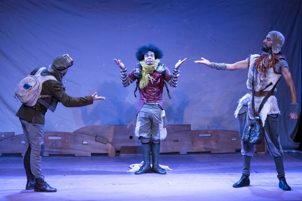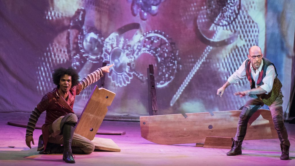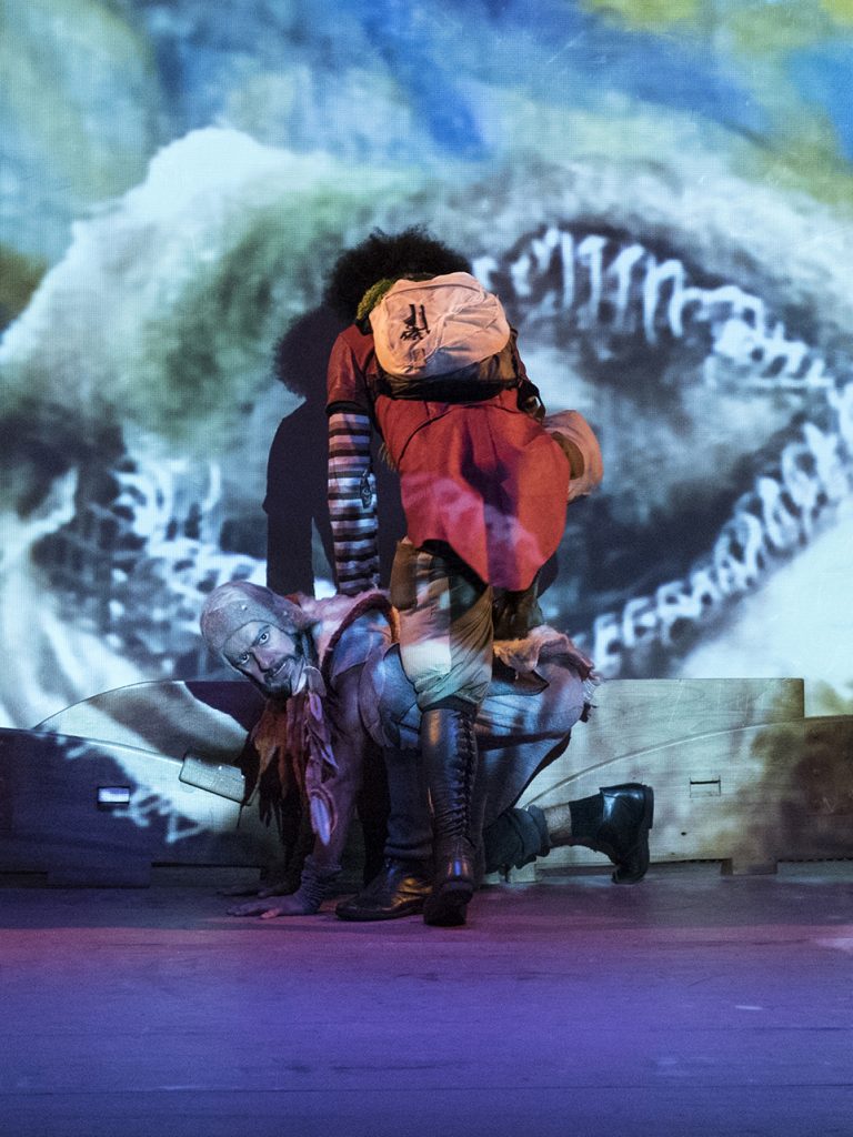 A combinação dos elementos visuais, somada a manipulação de peças de madeira proporcionam uma transformação constante do espaço cênico, compondo transportes, cavernas e outras surpresas que convidam o público a desbravar um mundo intraterrestre repleto de perigos, emoções e aventuras.